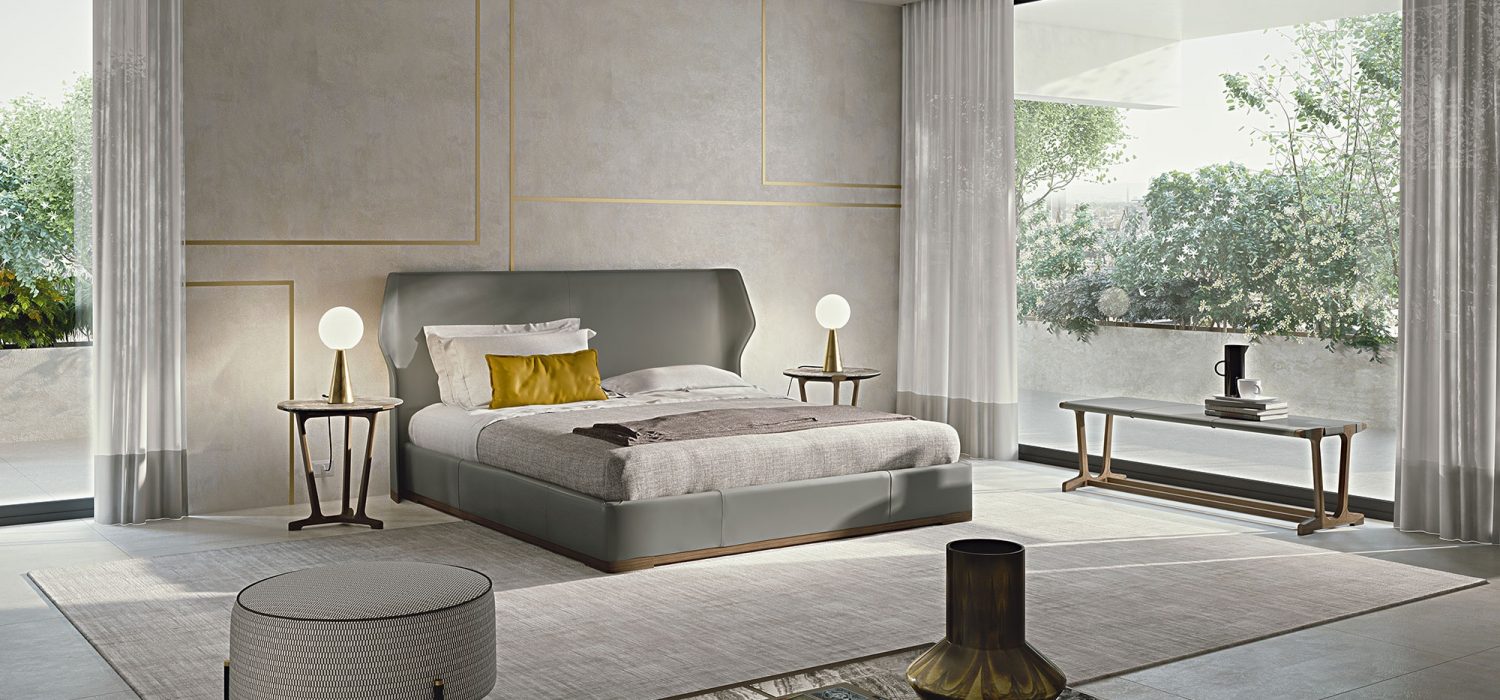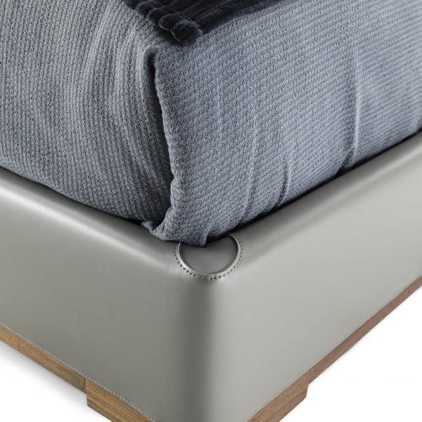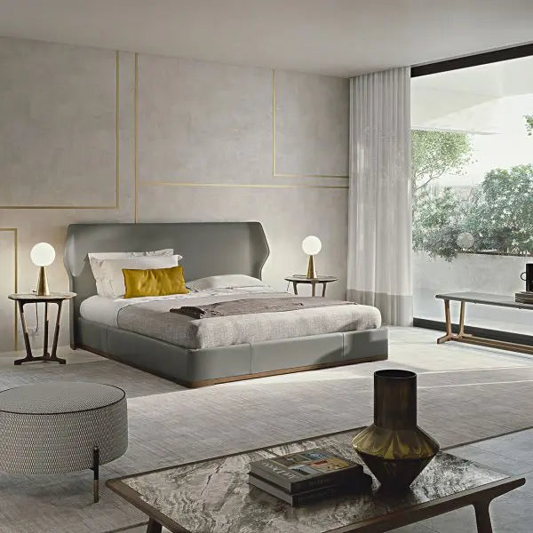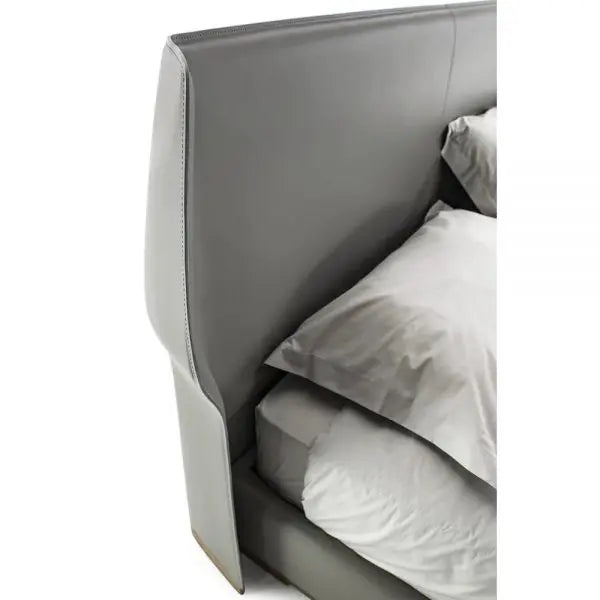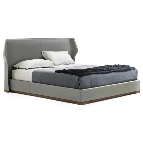 Skulpturales Schild für das Bett Agio mit Bezug aus Leder.Agio ist ein Vorschlag, der dank seiner feurigen Persönlichkeit dem Nachtbereich einen starken Charakter verleihen kann. Sein Markenzeichen ist das riesige, gewagte und doch umhüllende Kopfteil mit geformten Formen, die wie Flügel bis zum Boden reichen und den Bettrahmen umhüllen. Das Hautleder spricht mit dem Massivholzsockel, der in den Farben Nussbaum Canaletto oder Wenge erhältlich ist. Der Vorschlag wird durch eine raffinierte Schneiderei mit überlappenden Nähten rund um den Bettrahmen bereichert. Der Lattenrost ist aus Holz.