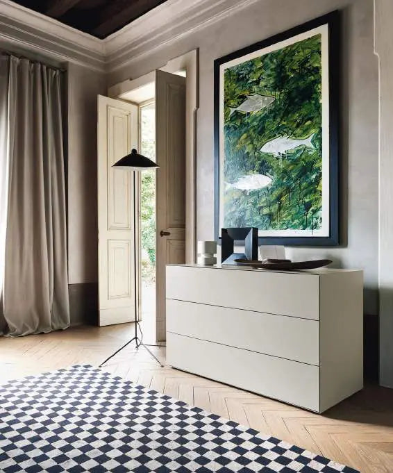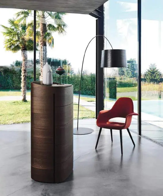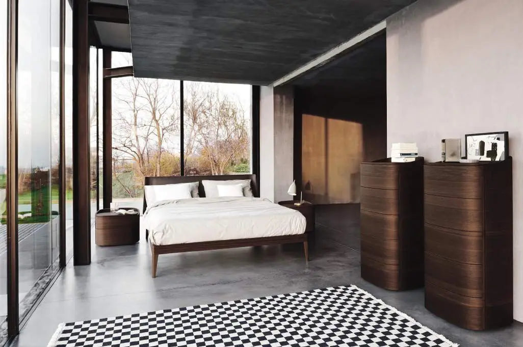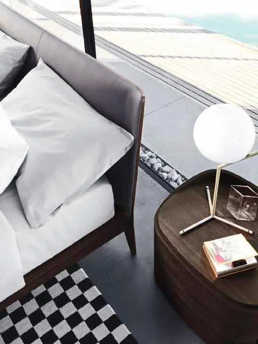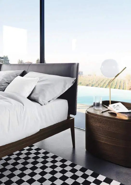 AALIANTE 2.0, einladende Leichtigkeit. Das Kopfteil des Bettes Aliante 2.0 zeichnet sich durch Linien aus, die sowohl Bewegung als auch Weichheit mit sich bringen. Die Vorderseite des Bettes ist mit einer dünnen, aber weichen Polsterung versehen, die eine bequeme Stütze in Echt- oder Kunstlederbezug bietet. Die Rückseite des Kopfteils und der Bettrahmen sind stattdessen lackiert, mit Füßen aus Holz in der gleichen Ausführung oder aus braunem oder titanfarbenem Metall.