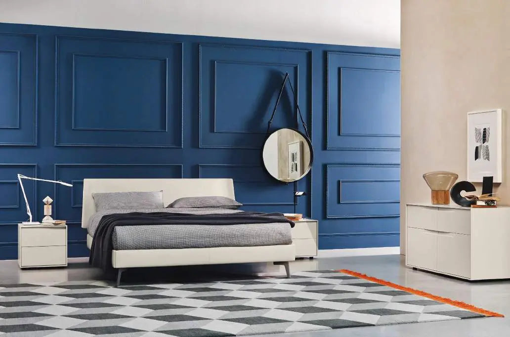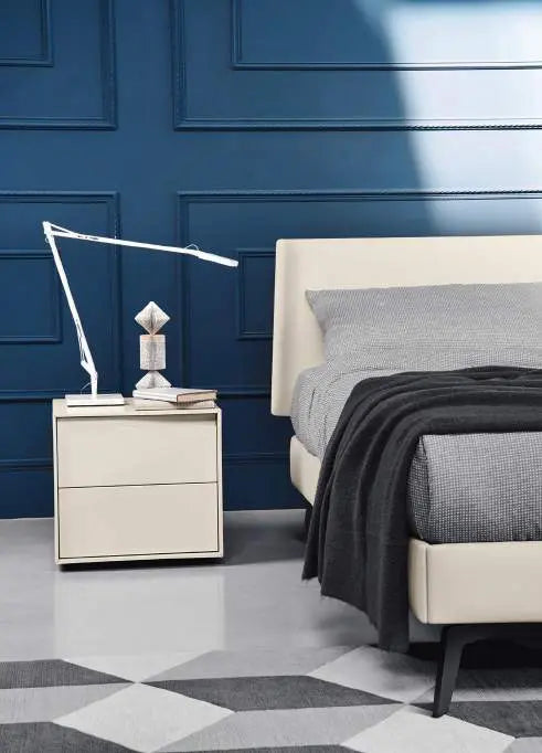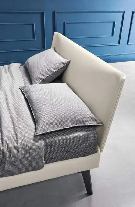 ALIANTE 3.0, pure Eleganz. Die großzügigen und geschwungenen Formen des Kopfteils von Aliante 3.0 Kopfteil werden durch die Innenschale mit schlanker, weicher Polsterung, mit Kunstlederbezug noch komfortabler. Die Rückseite des Kopfteils ist stattdessen matt lackiert, in der gleichen Farbe oder kontrastierend. Das wirkungsvolle Design des Ganzen verbindet sich mit der funktionellen Seite: Die umlaufenden Bänder des Bettrahmens sind nämlich gepolstert und gepolstert einzeln, daher ist die Montage sehr einfach und problemlos. Die Füße sind aus Metall, geformt mit einer Form von Vintage-Inspiration, in dunkelbraunem oder hellem Titan-Finish.