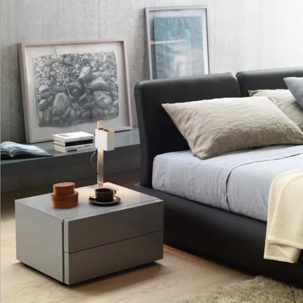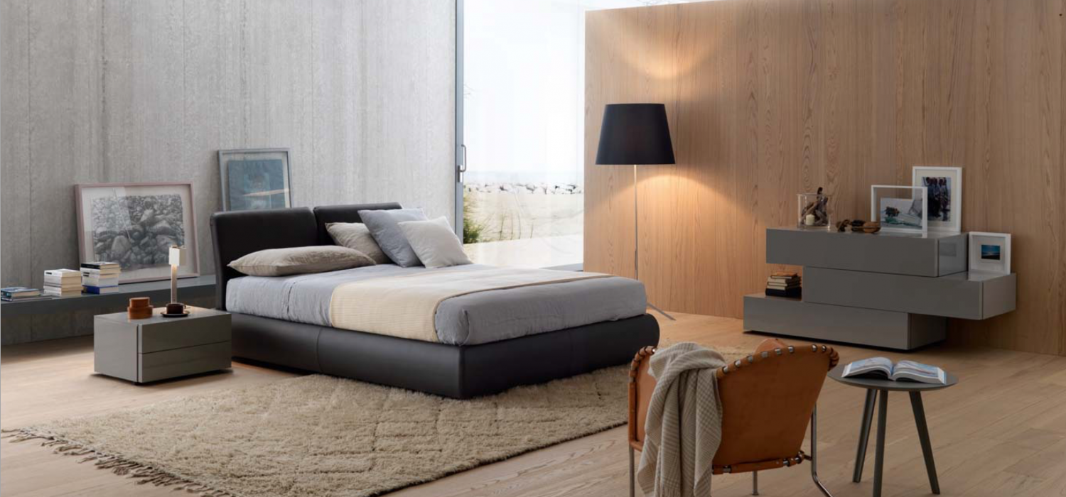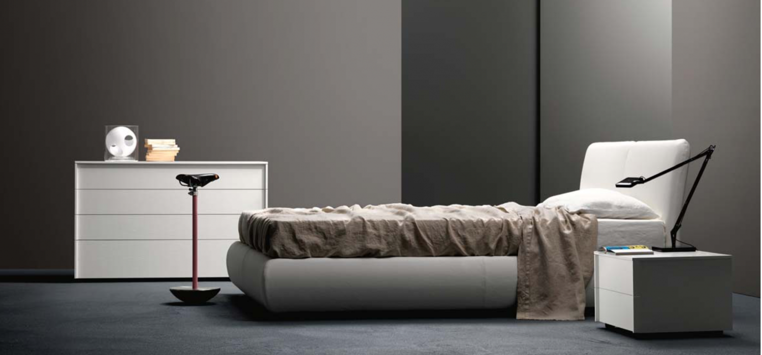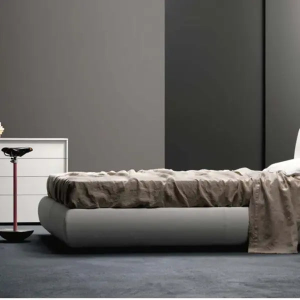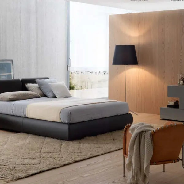 Bambò präsentiert sich mit einem Bettrahmen von beachtlicher Dicke und ist mit weichem Leder gepolstert. Das feste Kopfteil erhebt sich schlank aus der abgerundeten Struktur des Bettrings und schwingt sich sanft. Das Ergebnis ist die Reduktion des Raumes, begünstigt durch die optische Trennung in zwei unterschiedliche Elemente. An allen vier Seiten sorgfältig verarbeitet, erlaubt Bambò eine größere Freiheit