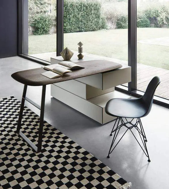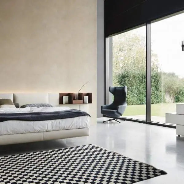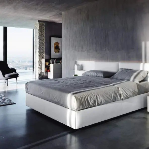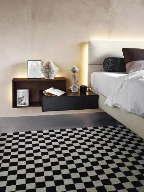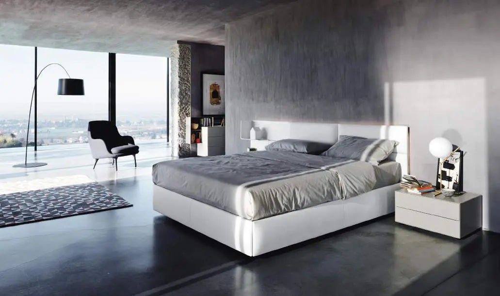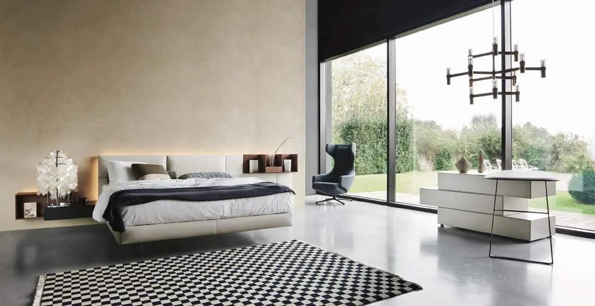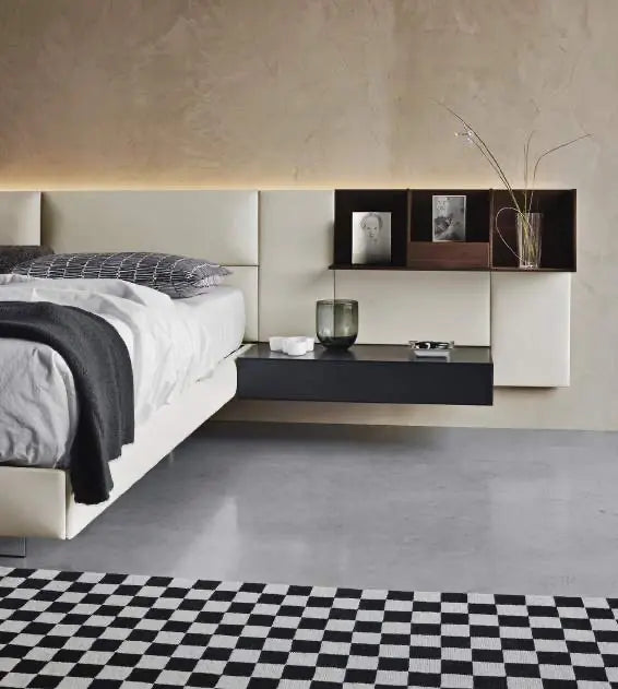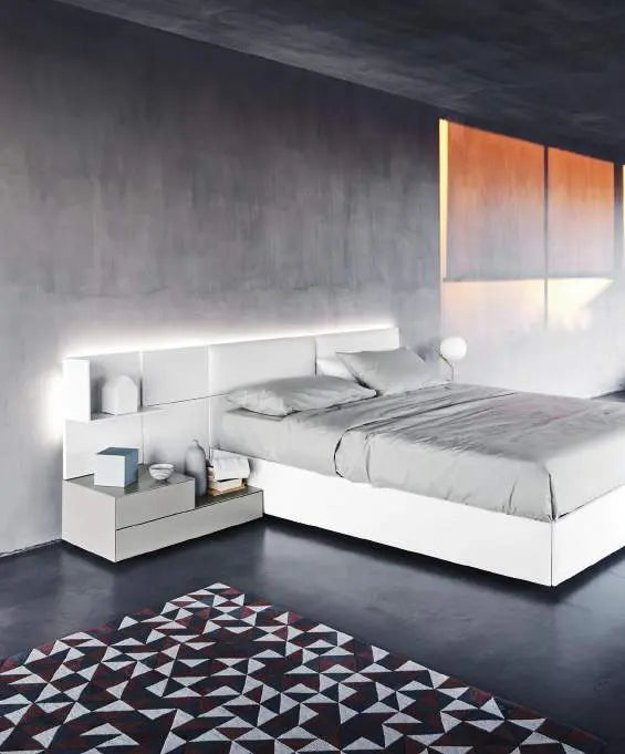 ECLETTO, Freiheit zum Träumen. Ecletto, das ist eine eklektische Betteinheit, bei der das Kopfteil aus Holz oder gepolsterten Paneelen besteht, die auch mit Schränken und offenen Elementen kombiniert werden können. Entwickelt aus einem 300-mm-Quadratmodul, können die Paneele sowohl vertikal als auch horizontal frei positioniert werden und auch ihre Anordnung im Laufe der Zeit verändern. Dieses einfache Konzept führt zu einer sehr hohen Flexibilität in der Gestaltung, die sich auch auf den Einsatz von Schubladeneinheiten, mit Verbindung der Schale unter 45° und Push-Pull-Öffnung, sowie auf offene Einheiten, ebenfalls modular, erstreckt. Eine perforierte Rückwand verbindet die Komposition miteinander und ermöglicht die Installation eines LED-Systems entlang des Umfangs des Kopfteils, wodurch ein ansprechender Lichteffekt entsteht.