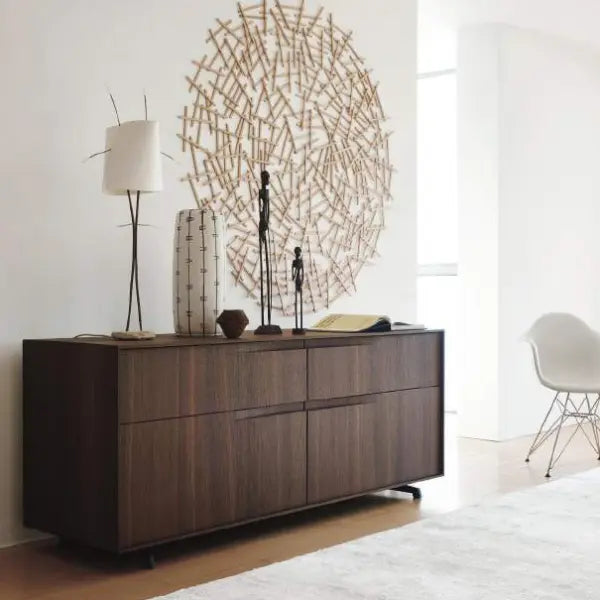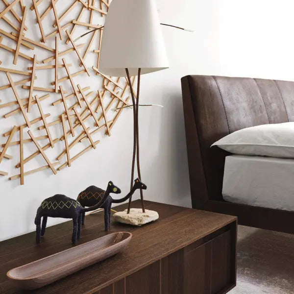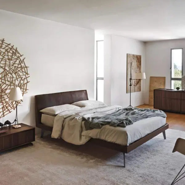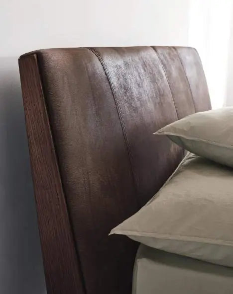 FEBO X, VIELSEITIGE PERSÖNLICHKEIT. In dieser Version unterstreicht das Bett Febo seine Eignung zur Integration verschiedener Materialien. Das Holz umrahmt das Vintage-Leder oder, wenn gewünscht, das Echt- oder Kunstleder, das das Kopfteil bedeckt, das durch eine großzügige Polsterung von handwerklicher Qualität einladend und ergonomisch gestaltet ist. Die Füße des Bettes, mit einer markanten Form, sind aus Metall mit braunem oder titanfarbenem Finish.