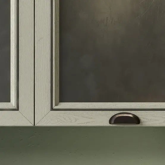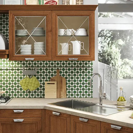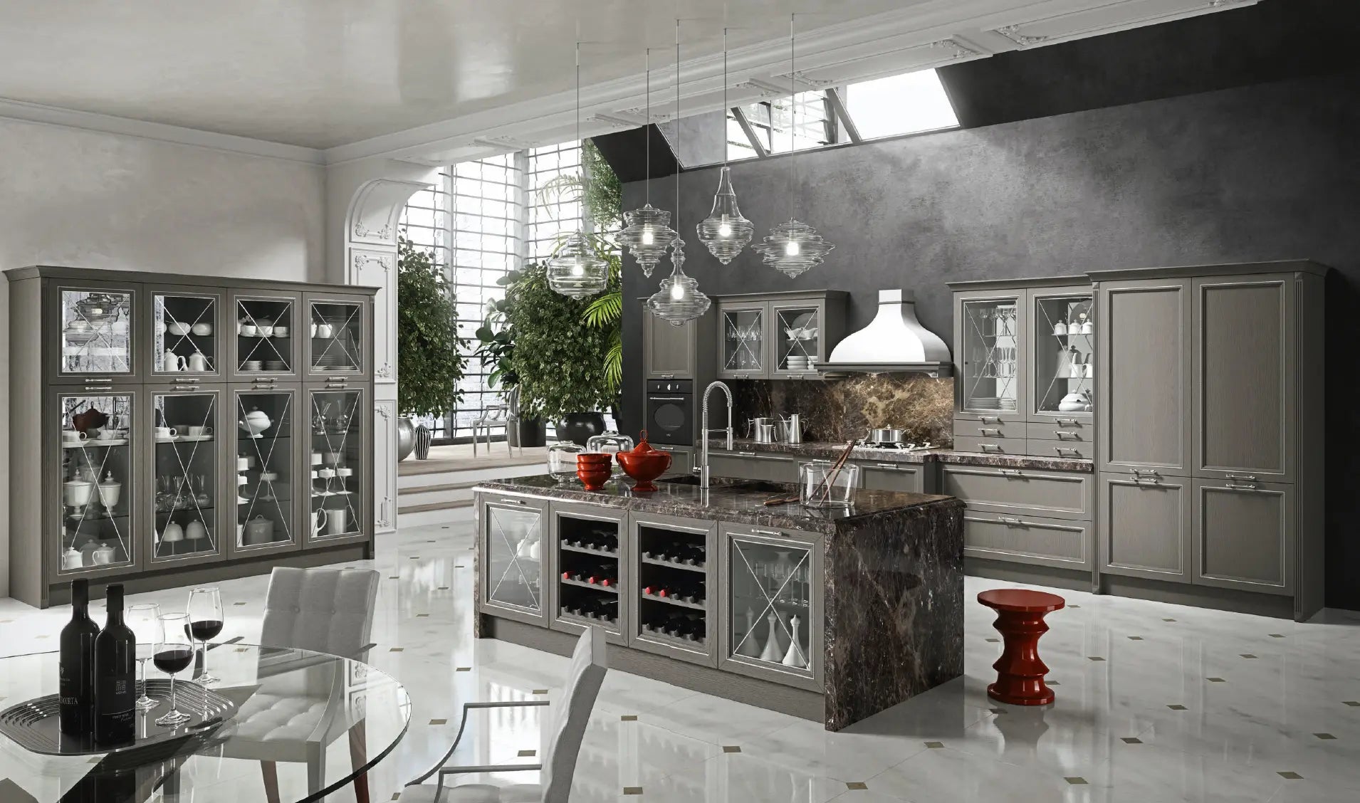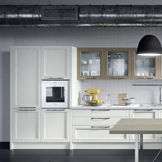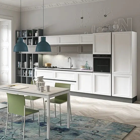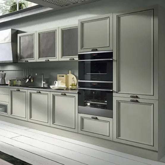 Es ist eine äußerst benutzerfreundliche Küche mit einem starken materiellen Fußabdruck. Paneel aus Edelstahl, Rahmen mit Silberdekor, Oberflächen aus weißer Esche, Ton, Titan und Grün, Griffe oder konkaver C-Kanal.