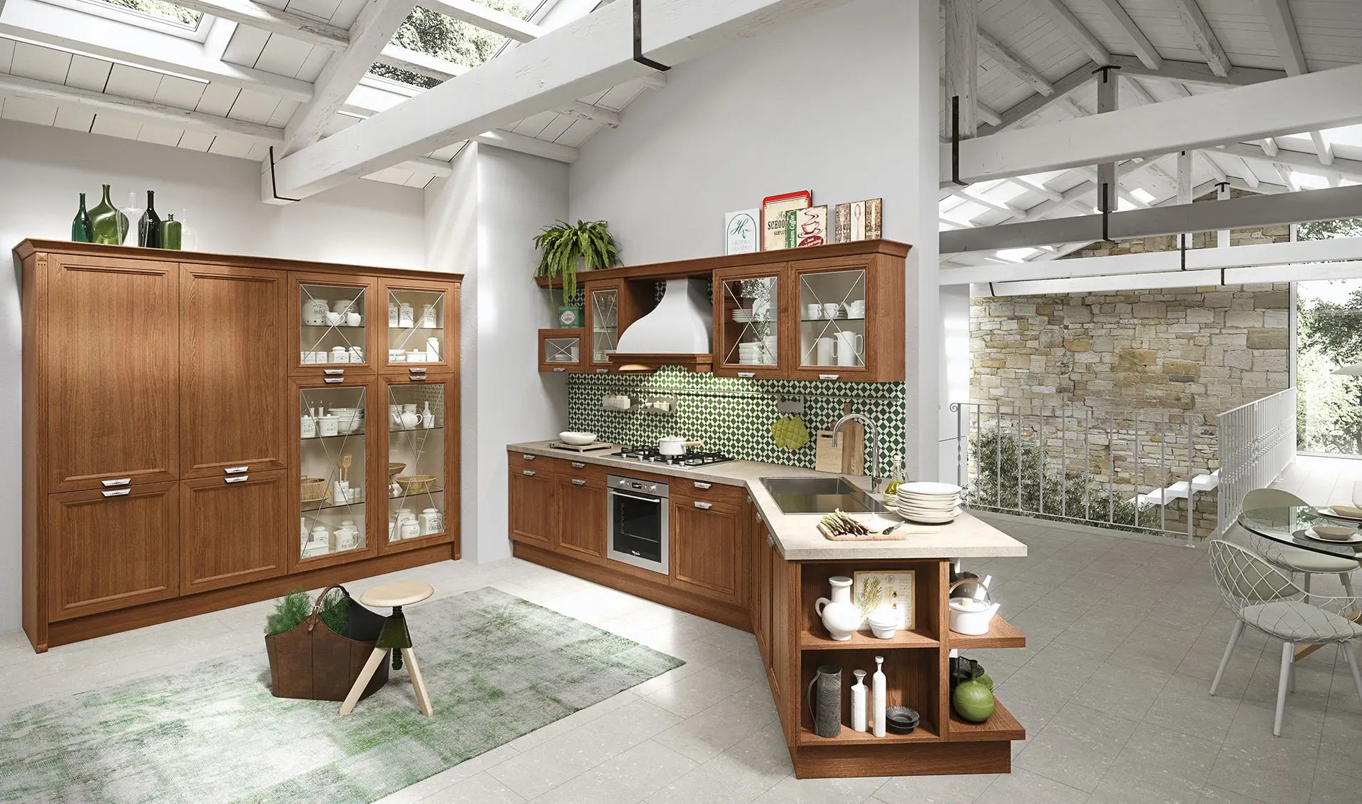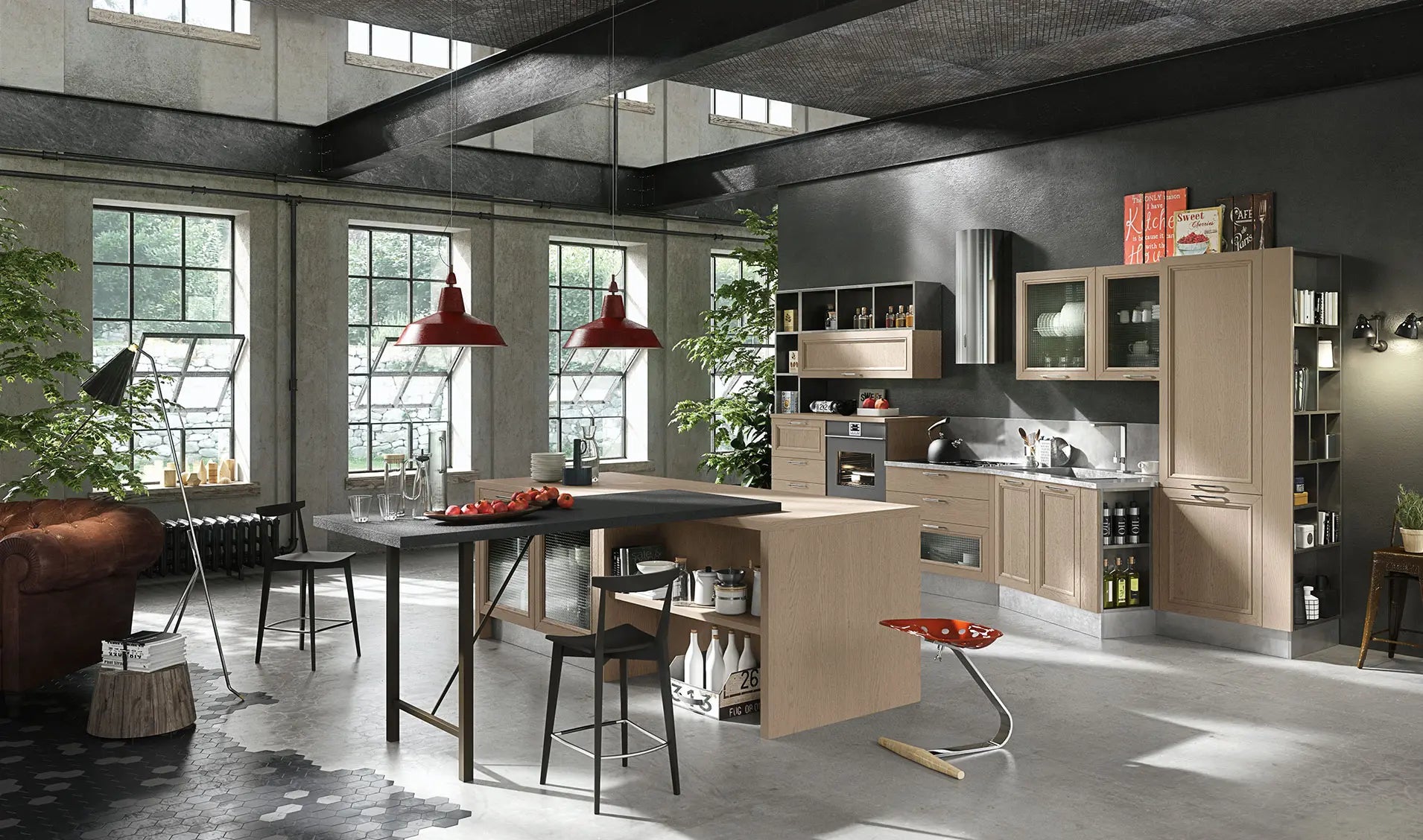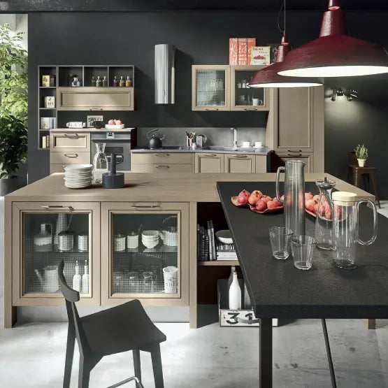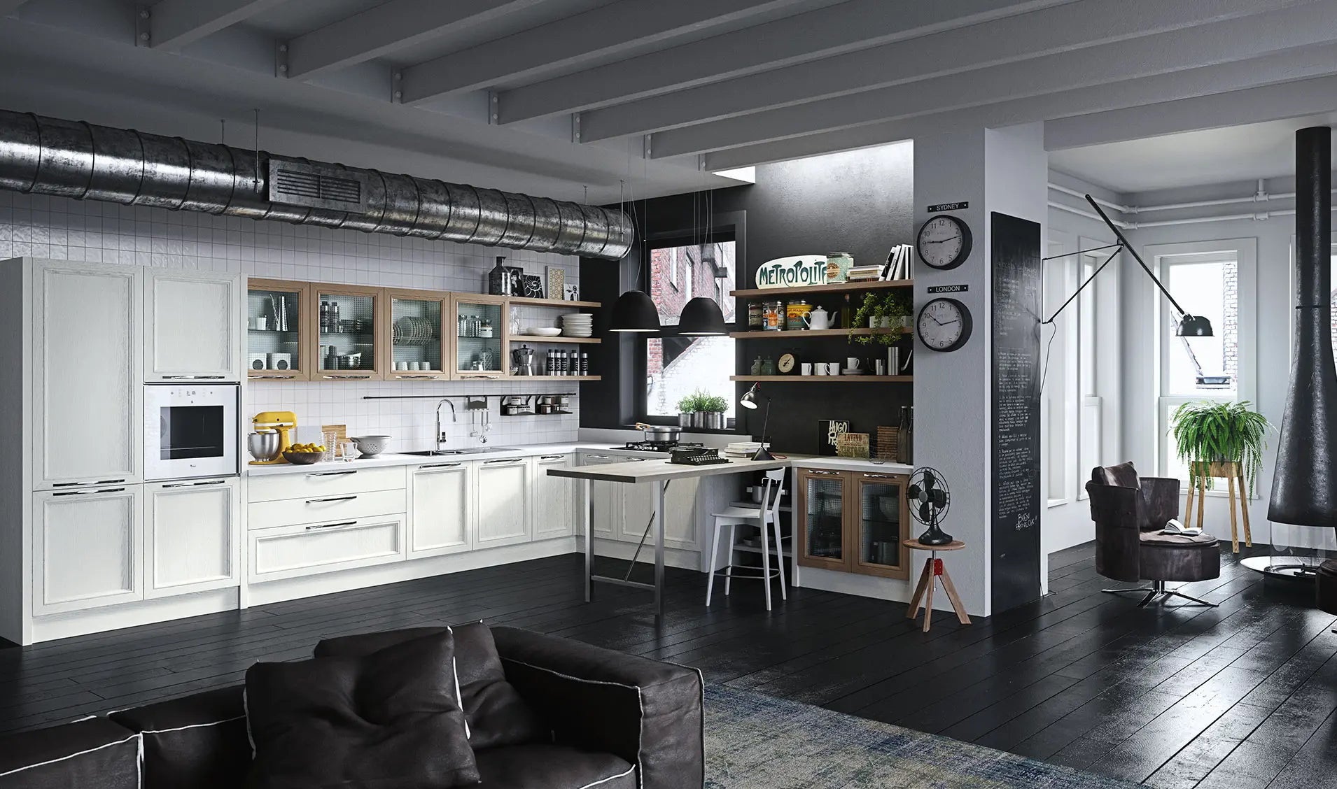 Es ist eine äußerst benutzerfreundliche Küche mit einem starken materiellen Fußabdruck. Paneel aus Edelstahl, Rahmen mit Silberdekor, Oberflächen aus weißer Esche, Ton, Titan und Grün, Griffe oder konkaver C-Kanal.