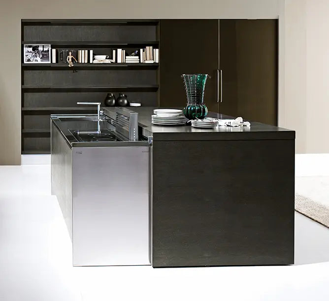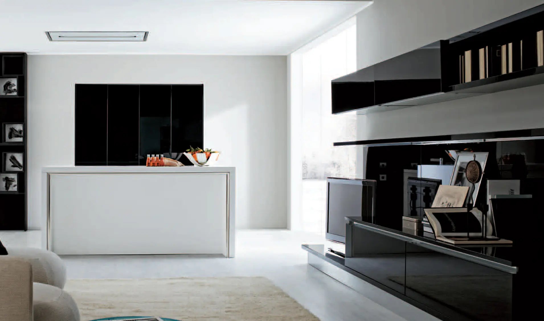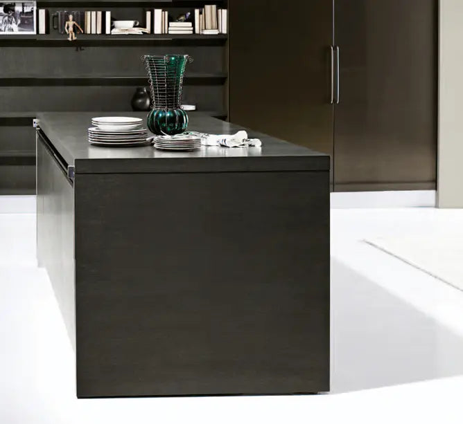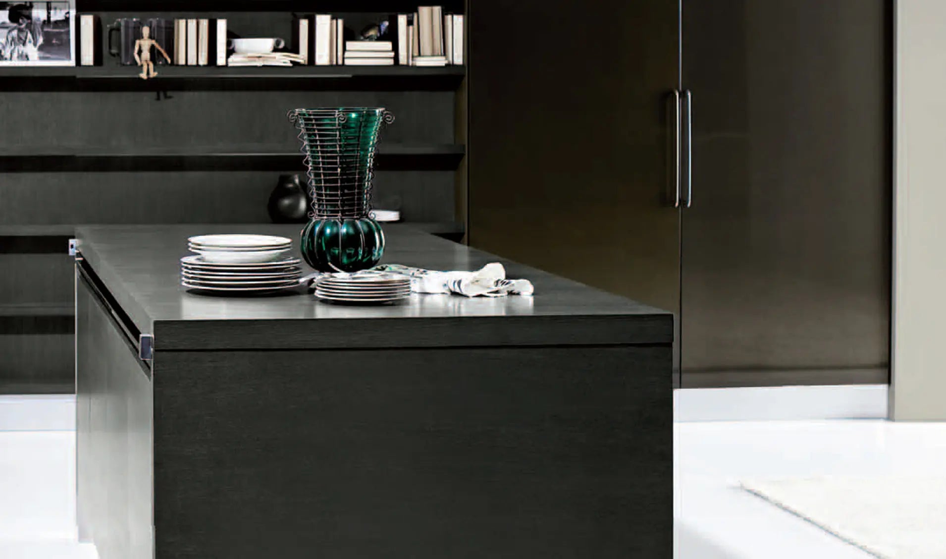 Met, die metropolitan future kitchen, ist ein flexibles Möbelstück, das sich bewegen, transformieren und an neue Lebensstile und Konsumgewohnheiten anpassen kann, projiziert in eine Zukunft der ökologischen Nachhaltigkeit. Die große Theke wird zu einer Konsole und einem geordneten, angenehmen Wohnbereich.