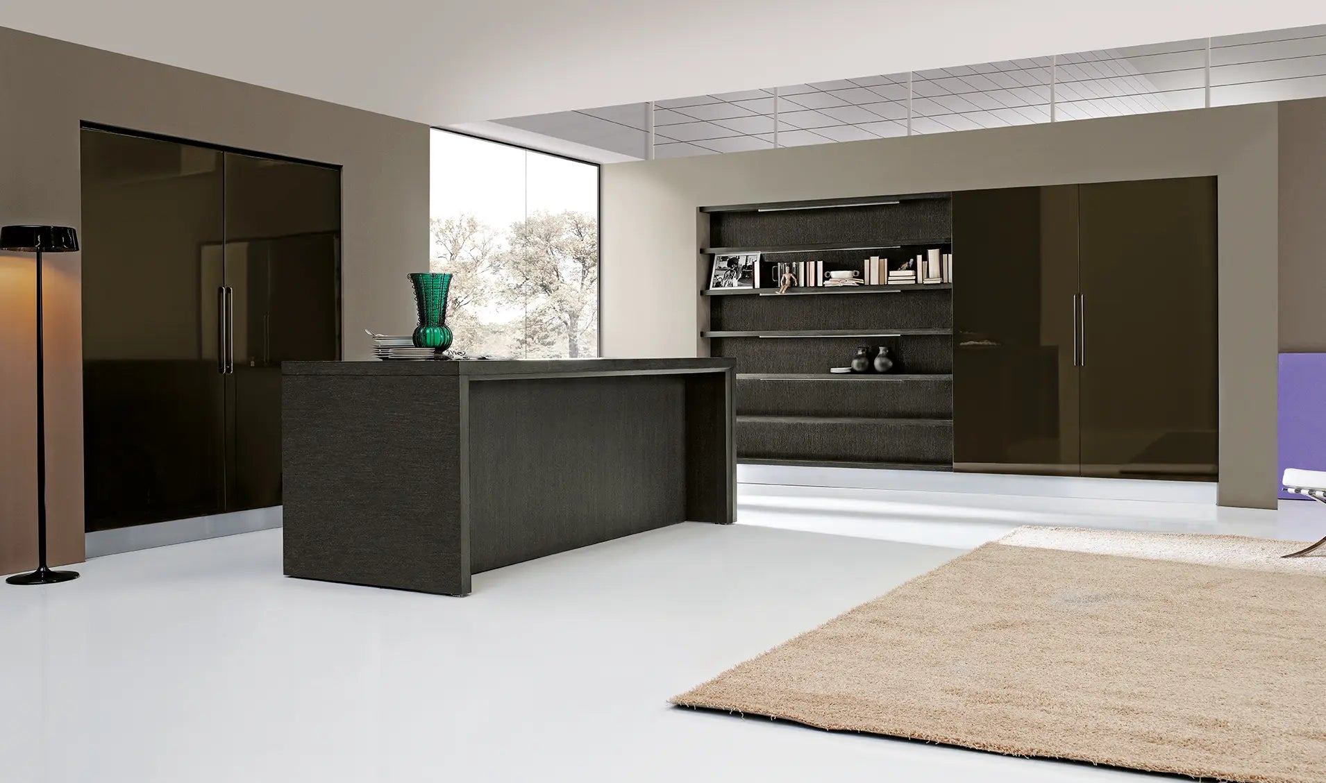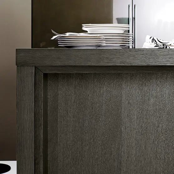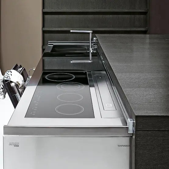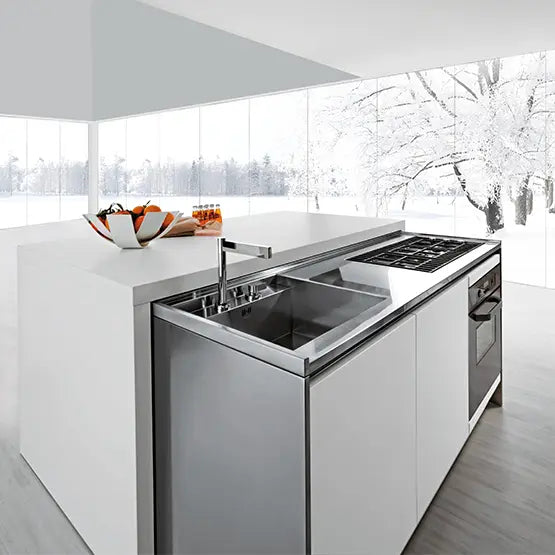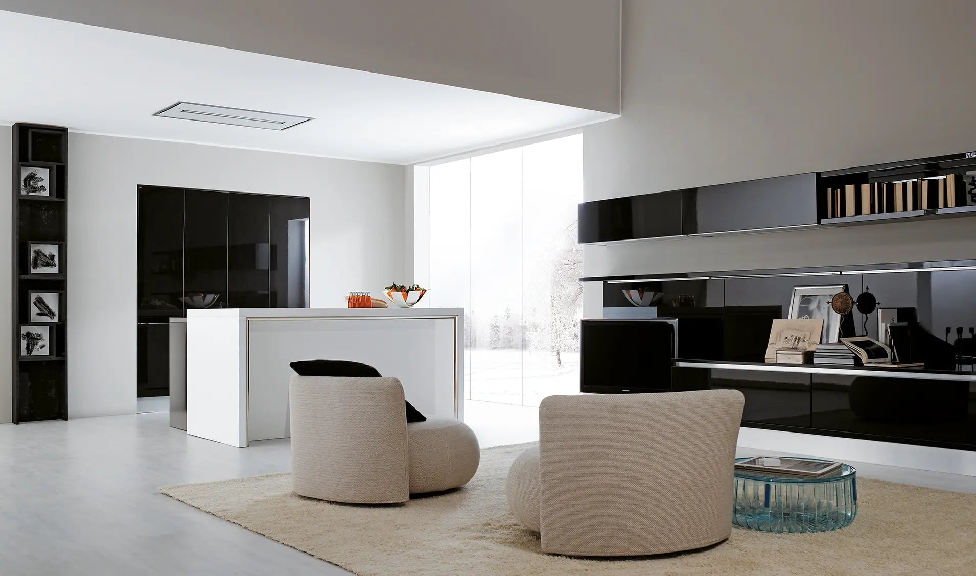 Met, die metropolitan future kitchen, ist ein flexibles Möbelstück, das sich bewegen, transformieren und an neue Lebensstile und Konsumgewohnheiten anpassen kann, projiziert in eine Zukunft der ökologischen Nachhaltigkeit. Die große Theke wird zu einer Konsole und einem geordneten, angenehmen Wohnbereich.