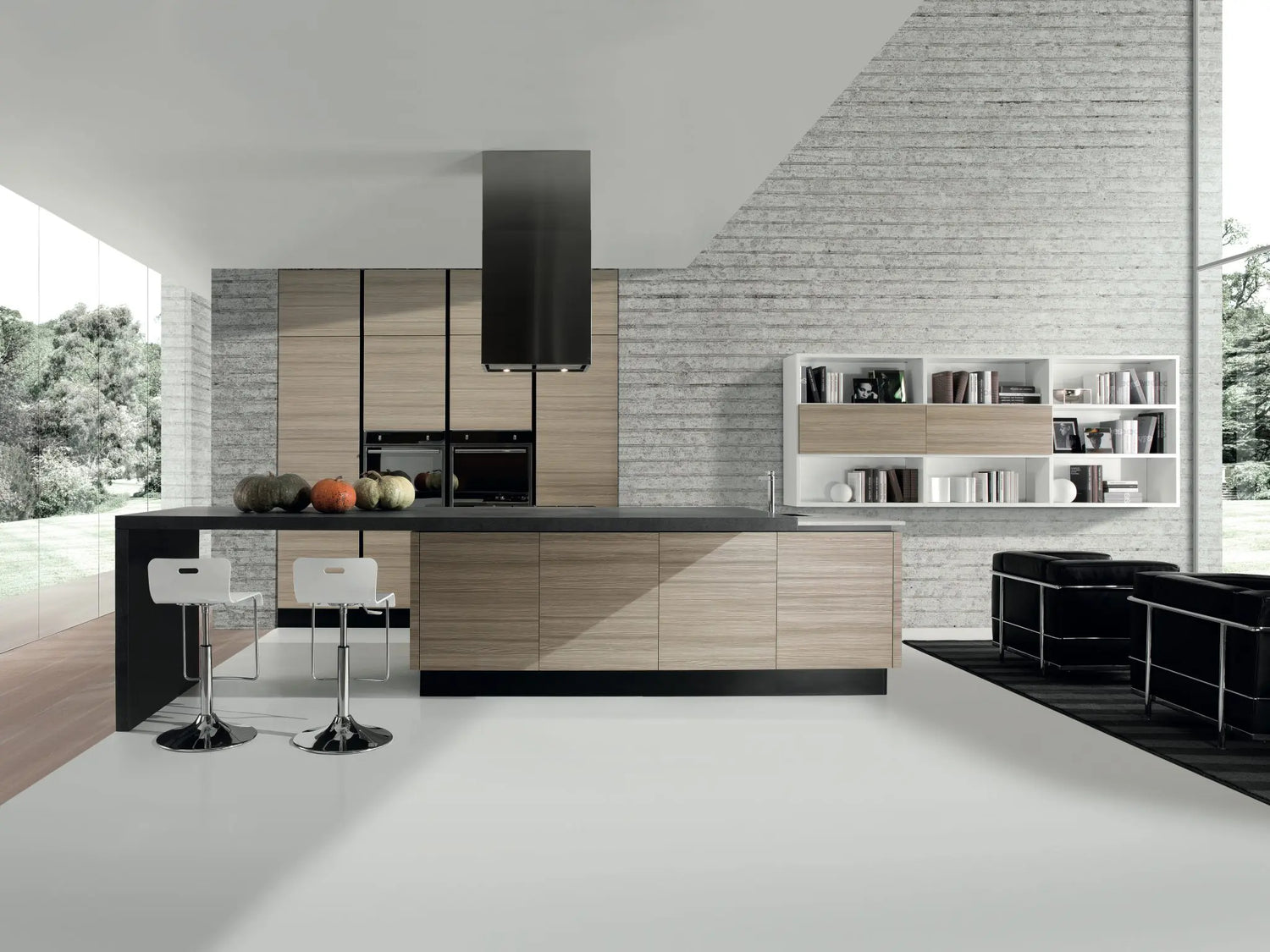 Die Bühne besteht aus einem imposanten und kompakten Bereich in einem Stück, ausgestattet zum Zubereiten und Kochen. Der Vorhang besteht aus einem eintürigen Hängeschrank mit Glasböden, Haube und integrierter Beleuchtung.