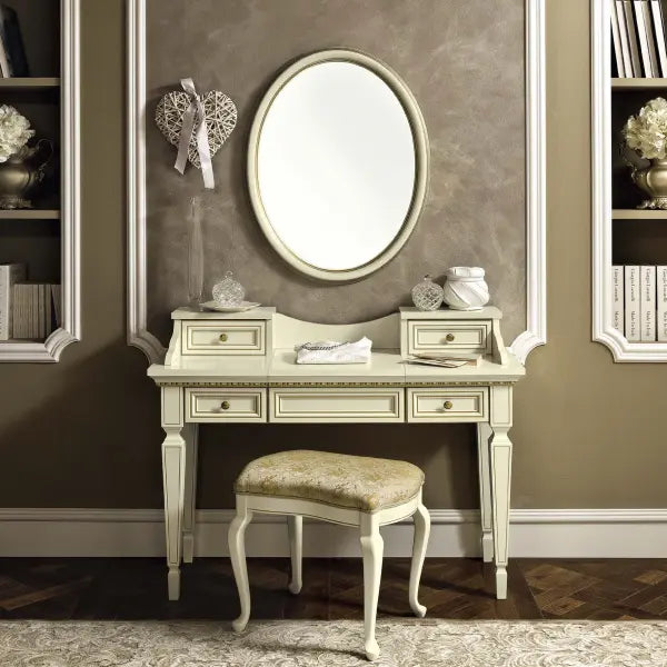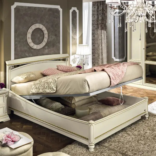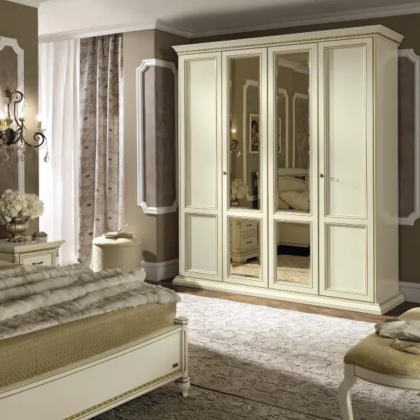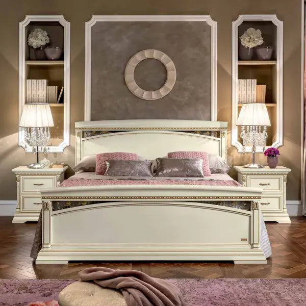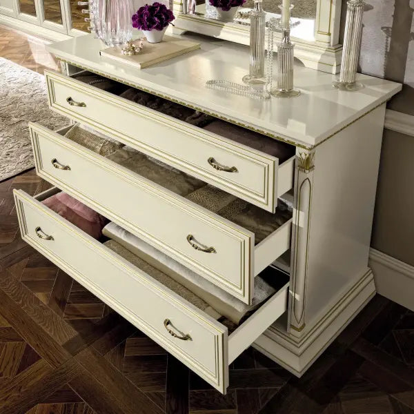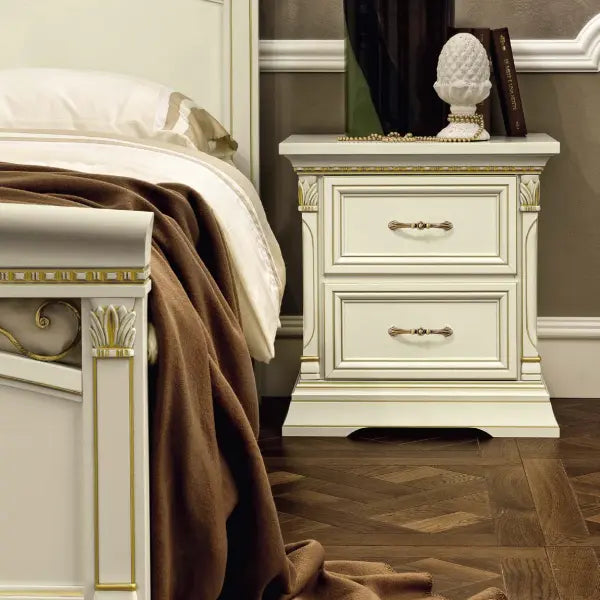 Das halboffenporige Elfenbeinfinish auf Eschenholzfurnier definiert sanft den Lack und die Holzmaserung. Helle und goldene handgefertigte Verzierungen bereichern die Gravuren und Ornamente der TREVISO Ash Kollektion.