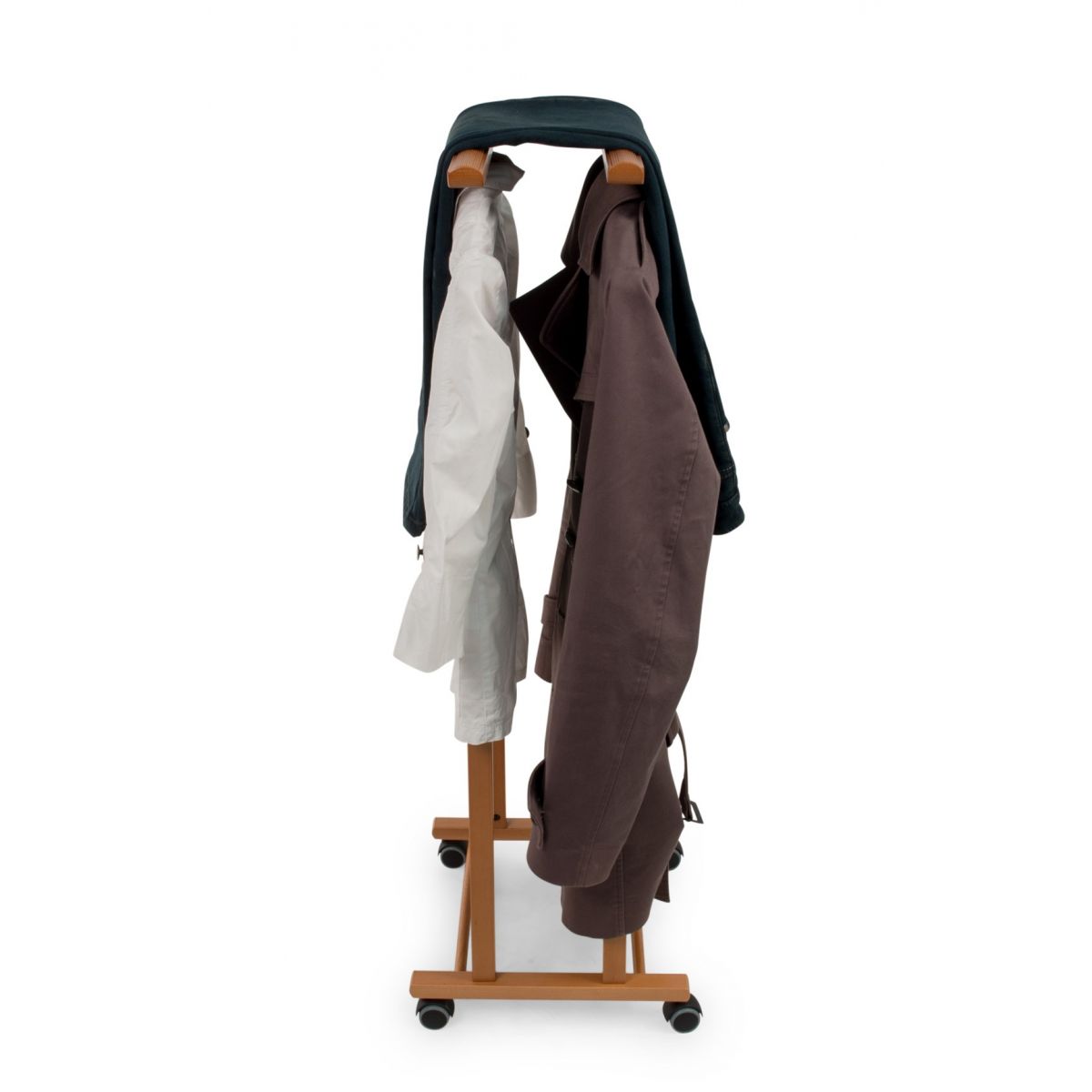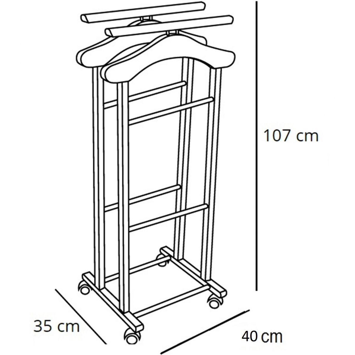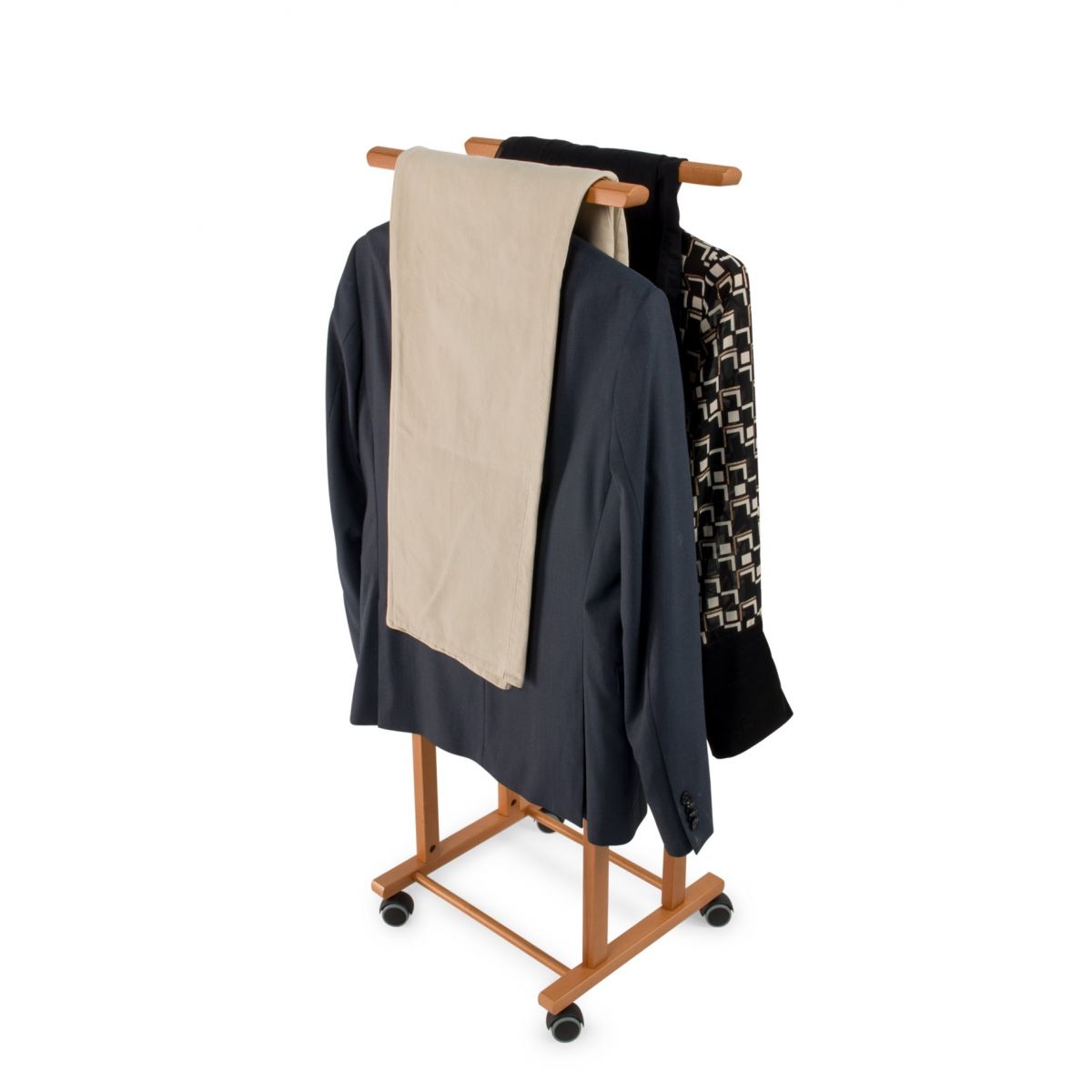 "Kleiderbügel für Schlafzimmer CLEVER, Holz - Doppelkleiderbügel - Kirschholz-Finish • Vollständig aus massiver Buche gefertigt • Schwenkbare gummibeschichtete Räder zum einfachen Bewegen und Verschieben. • Bestehend aus zwei Kleiderbügeln und zwei Hosenstangen • Solide Basis aus massiver Buche • Die Morgen werden angenehmer sein dank unserer Kleiderbügel, Sie werden Ihre Kleidung immer bereit zum Anziehen finden • Produkt leicht zu montieren • ORIGINAL MADE IN ITALY, exklusiv hergestellt von ARREDAMENTI ITALIA GROUP S.R.L."