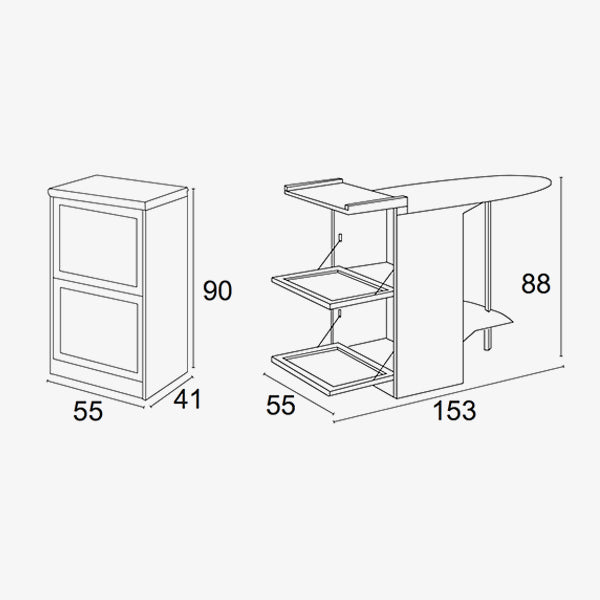 • Bei geschlossenem Zustand wird es zu einem mobilen Schrank mit zwei geräumigen Regalen mit Einzelöffnung